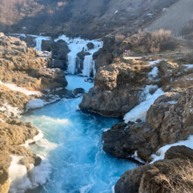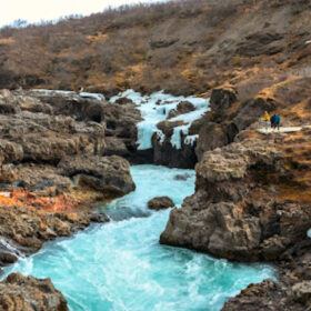 La cascata di Barnafoss, situata nell’ovest dell’Islanda, è un affascinante esempio di come le forze geologiche plasmino il paesaggio naturale. Conosciuta per le sue acque impetuose e il blu intenso, Barnafoss non si distingue per la sua altezza ma per la sua vivacità e per il contesto geologico in cui si trova. La cascata si trova in un’area ricca di formazioni laviche, risultato di eruzioni vulcaniche avvenute millenni fa. Queste formazioni creano un letto irregolare per il fiume Hvítá, che alimenta Barnafoss, generando rapide e gorghi intensi mentre l’acqua si fa strada attraverso stretti canali nella roccia.