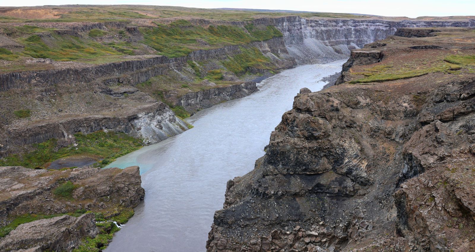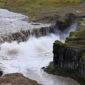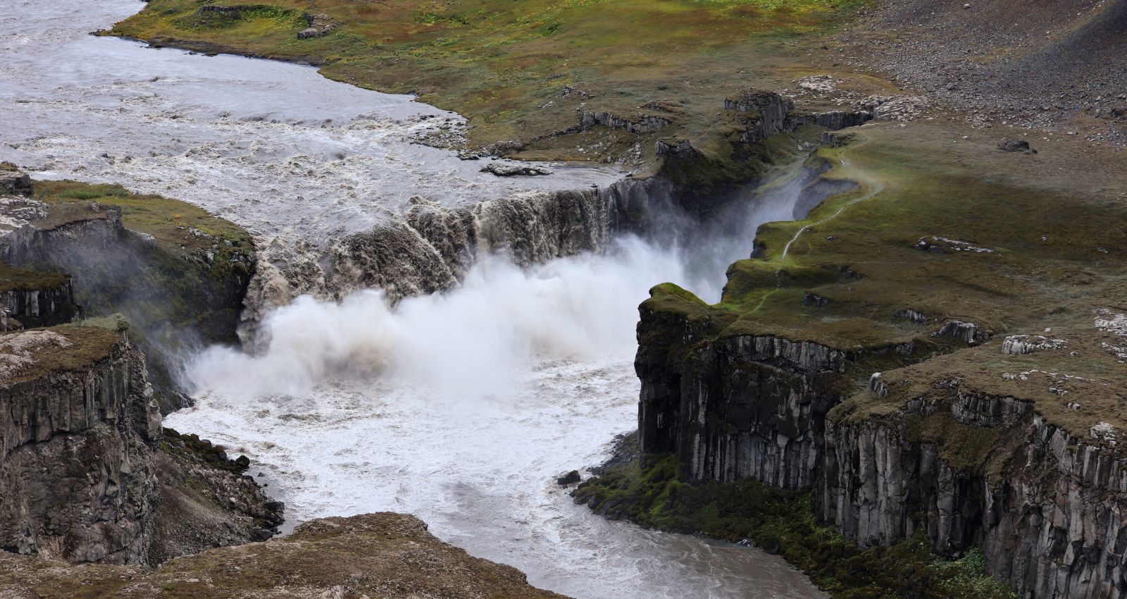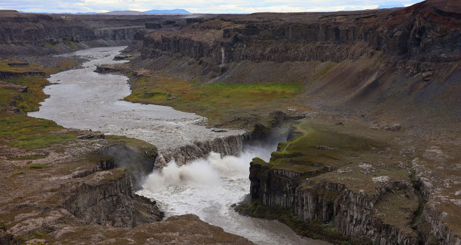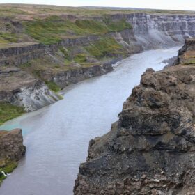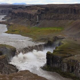 Hafragilsfoss è meno famosa rispetto a Dettifoss, ma il suo fascino sta proprio nella posizione: la cascata si tuffa per circa 27 metri nel canyon, creando uno scenario drammatico di acqua, rocce e lava antica. Qui il fiume Jökulsá á Fjöllum mostra tutta la sua forza, e il panorama dall’alto permette di ammirare sia la caduta che il canyon sottostante in un unico sguardo.