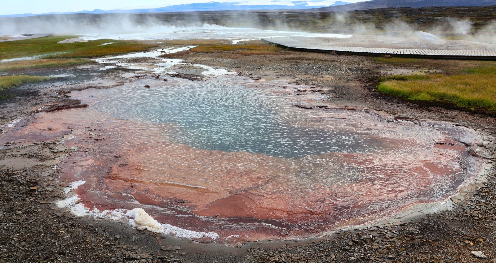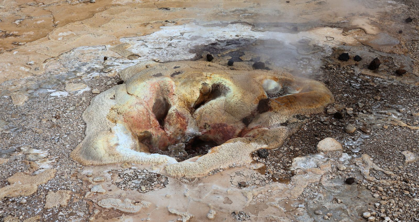 Hveravellir è il risultato dell’incontro tra vulcanismo e ghiaccio: fratture profonde convogliano calore verso la superficie, riscaldando le falde che alimentano geyser dormienti, sorgenti, pozze di fango e terrazze di silice dai colori irreali. Il tutto si stende sul bordo del grande campo di lava di Kjalhraun, modellato da millenni di gelo e vento.