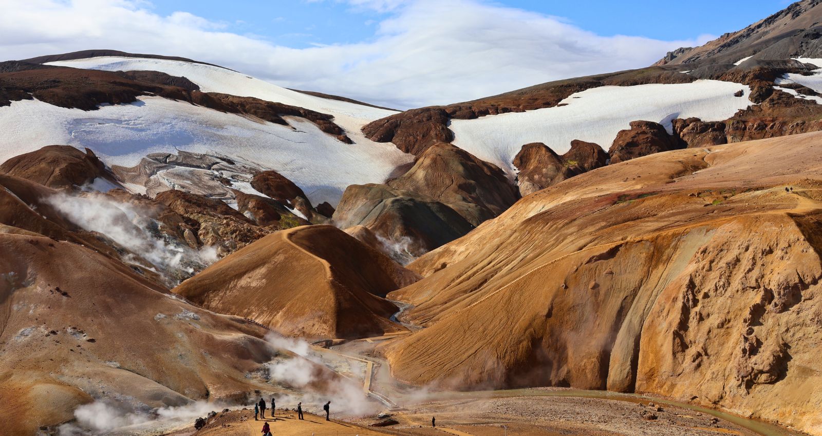 Kerlingarfjöll è un’area montuosa e geotermica nel cuore delle Highlands islandesi, incastonata tra i ghiacciai Hofsjökull e Langjökull. Qui la riolite – una roccia vulcanica chiara – è stata trasformata dall’azione del calore sotterraneo e dei ghiacci, creando colline arancioni e ocra, fumarole, solfatare e vallate fumanti. È l’incontro perfetto tra fuoco e ghiaccio: eruzioni antiche hanno depositato ceneri e lave acide; i ghiacciai le hanno scolpite; oggi l’acqua calda che risale dal sottosuolo colora e modella il paesaggio.La cosa più bella? Una volta raggiunti i parcheggi lungo la F347 (verso Hveradalir e l’area base), sei già dentro lo spettacolo: bastano pochi minuti a piedi per affacciarsi su terrazze naturali e passerelle che dominano valli di vapore e creste multicolore. Non serve lanciarsi in trekking lunghi e impegnativi come a Landmannalaugar: anche con passeggiate brevi avrai viste incredibili e fotografie da cartolina.