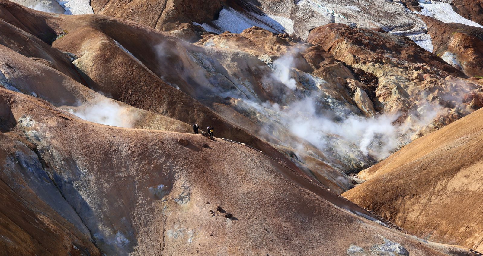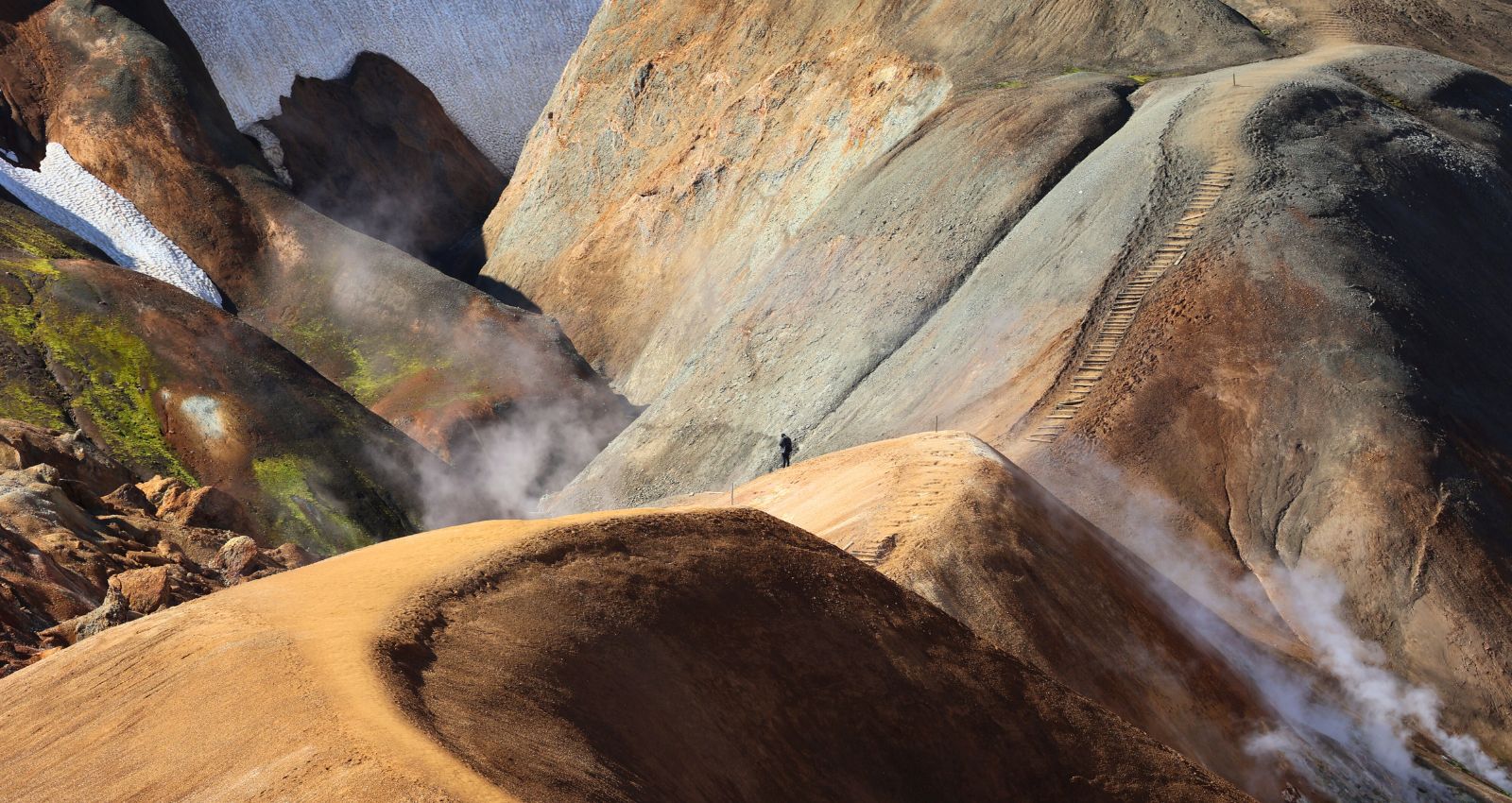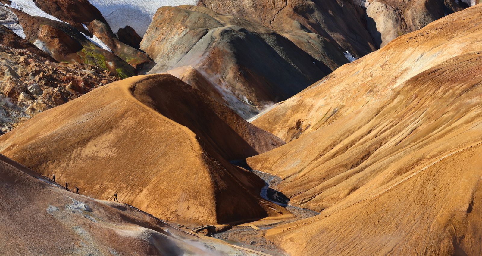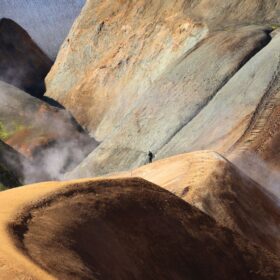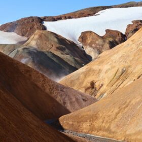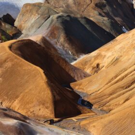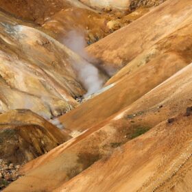Kerlingarfjöll è un’area montuosa e geotermica nel cuore delle Highlands islandesi, incastonata tra i ghiacciai Hofsjökull e Langjökull. Qui la riolite – una roccia vulcanica chiara – è stata trasformata dall’azione del calore sotterraneo e dei ghiacci, creando colline arancioni e ocra, fumarole, solfatare e vallate fumanti. È l’incontro perfetto tra fuoco e ghiaccio: eruzioni antiche hanno depositato ceneri e lave acide; i ghiacciai le hanno scolpite; oggi l’acqua calda che risale dal sottosuolo colora e modella il paesaggio.La cosa più bella? Una volta raggiunti i parcheggi lungo la F347 (verso Hveradalir e l’area base), sei già dentro lo spettacolo: bastano pochi minuti a piedi per affacciarsi su terrazze naturali e passerelle che dominano valli di vapore e creste multicolore. Non serve lanciarsi in trekking lunghi e impegnativi come a Landmannalaugar: anche con passeggiate brevi avrai viste incredibili e fotografie da cartolina.
