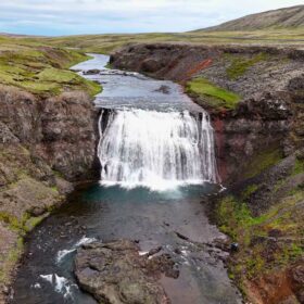 Proseguendo lungo la strada, farai una breve sosta per ammirare Þórufoss (Porufoss), una cascata nascosta e poco frequentata, situata in un contesto tranquillo e naturale. In pochi minuti di cammino potrai raggiungere la base della cascata, per una vista ravvicinata del salto d’acqua che si getta in un ampio anfiteatro roccioso.